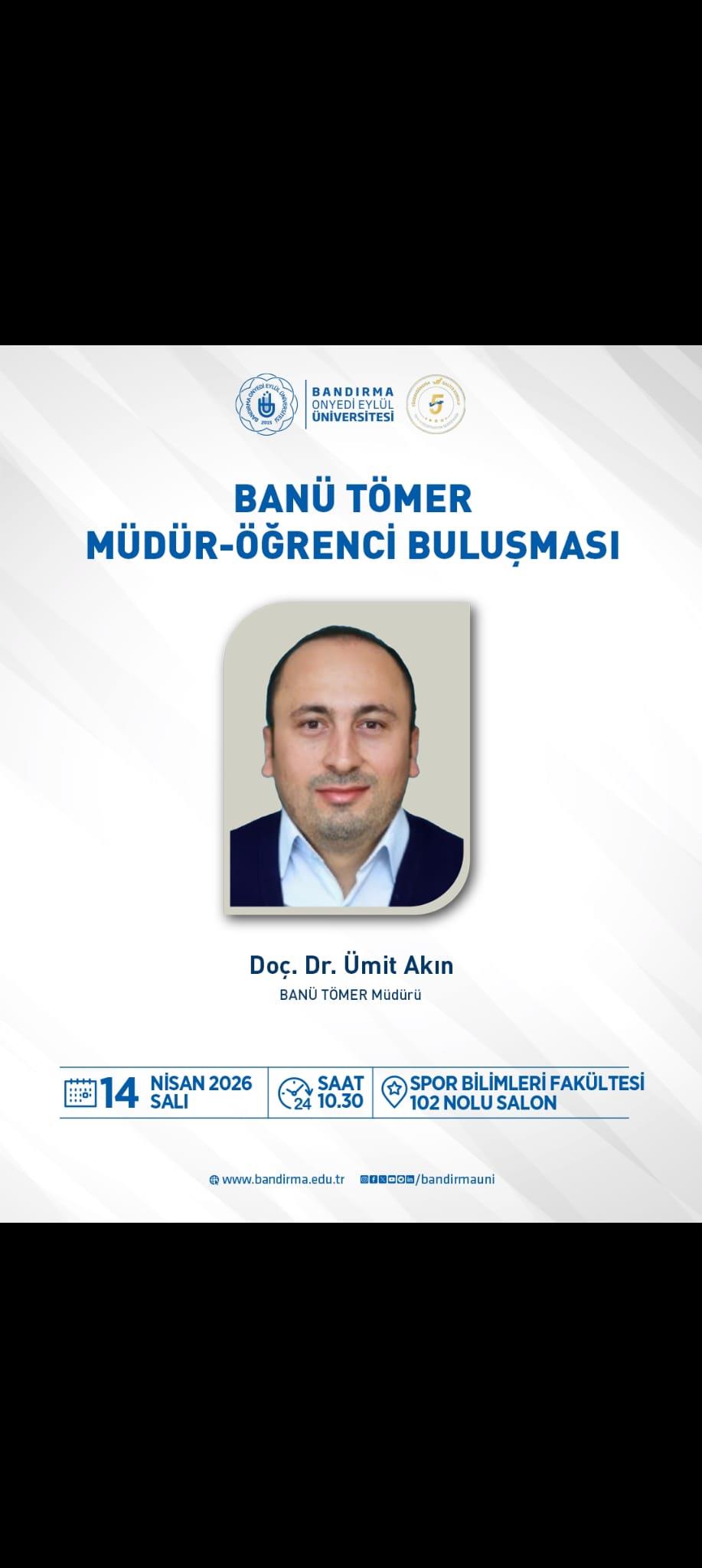 Merkez öğrenci ve kursiyerlerinin; ihtiyaçlarının yerinde tespit edilmesi, eğitim sürecine dair sorunlarını ve önerilerini doğrudan Merkez Müdürüne iletilebilmeleri adına 14.04.2026 Salı günü saat 10:30'da Spor Bilimleri Fakültesi 102 nolu Salonda "BANÜ-TÖMER Müdür-Öğrenci Buluşması" gerçekleştirilecektir.