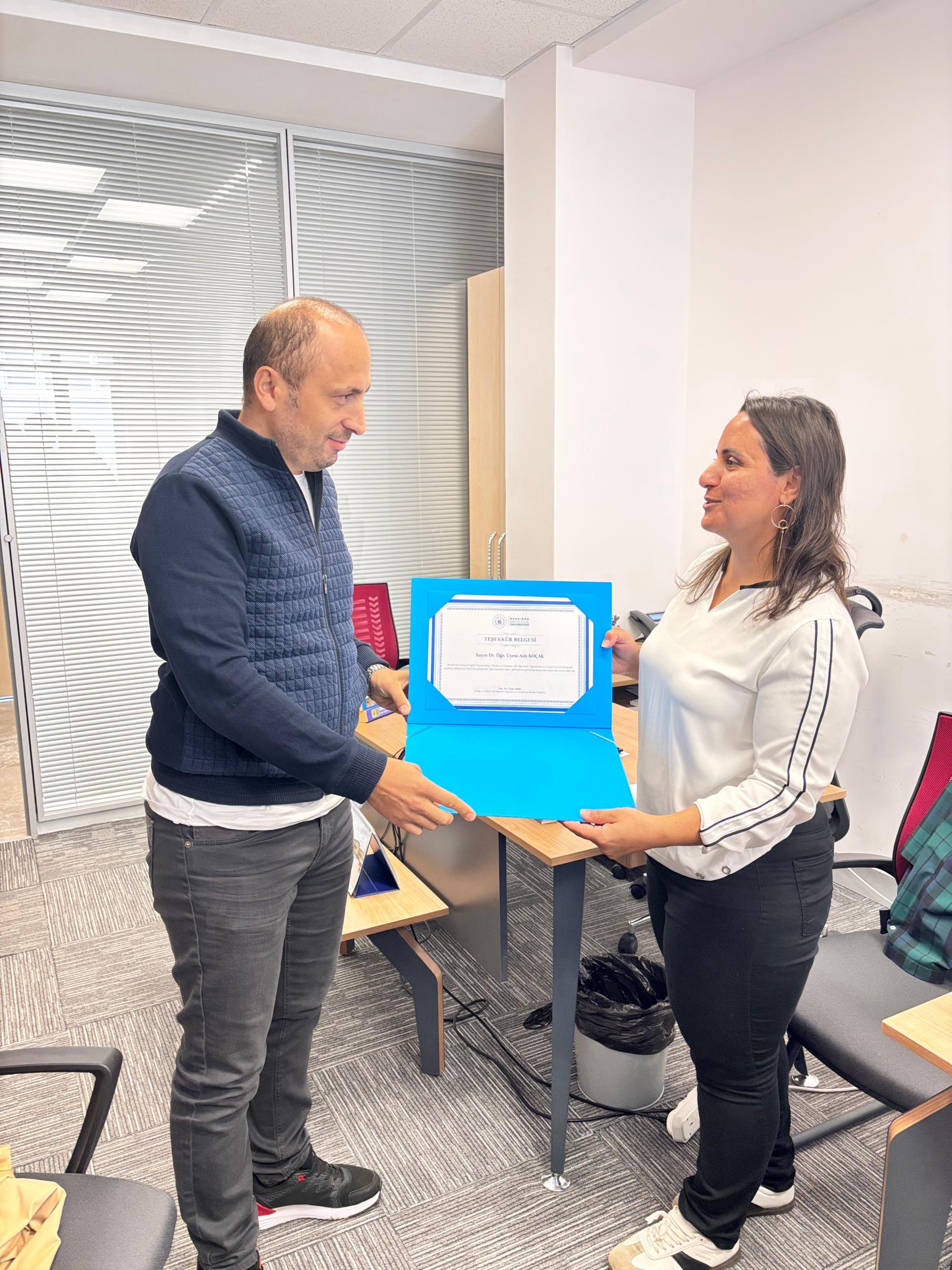 Merkez Müdürümüz Doç. Dr. Ümit AKIN, 2019-2025 yılları arasında Merkezimizde yabancı uyruklu öğrencilerimize/kursiyerlerimize Türkçe Hazırlık eğitimi veren Dr. Öğr. Üyesi Aslı KOÇAK’a göstermiş olduğu üstün gayret ve özverili çalışmaları için Teşekkür Belgesi takdim ederek başarılarının devamını diledi. Samimi bir sohbet ortamında gerçekleştirilen ziyaret fotoğraf çekimleriyle ebedileştirildi.
