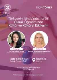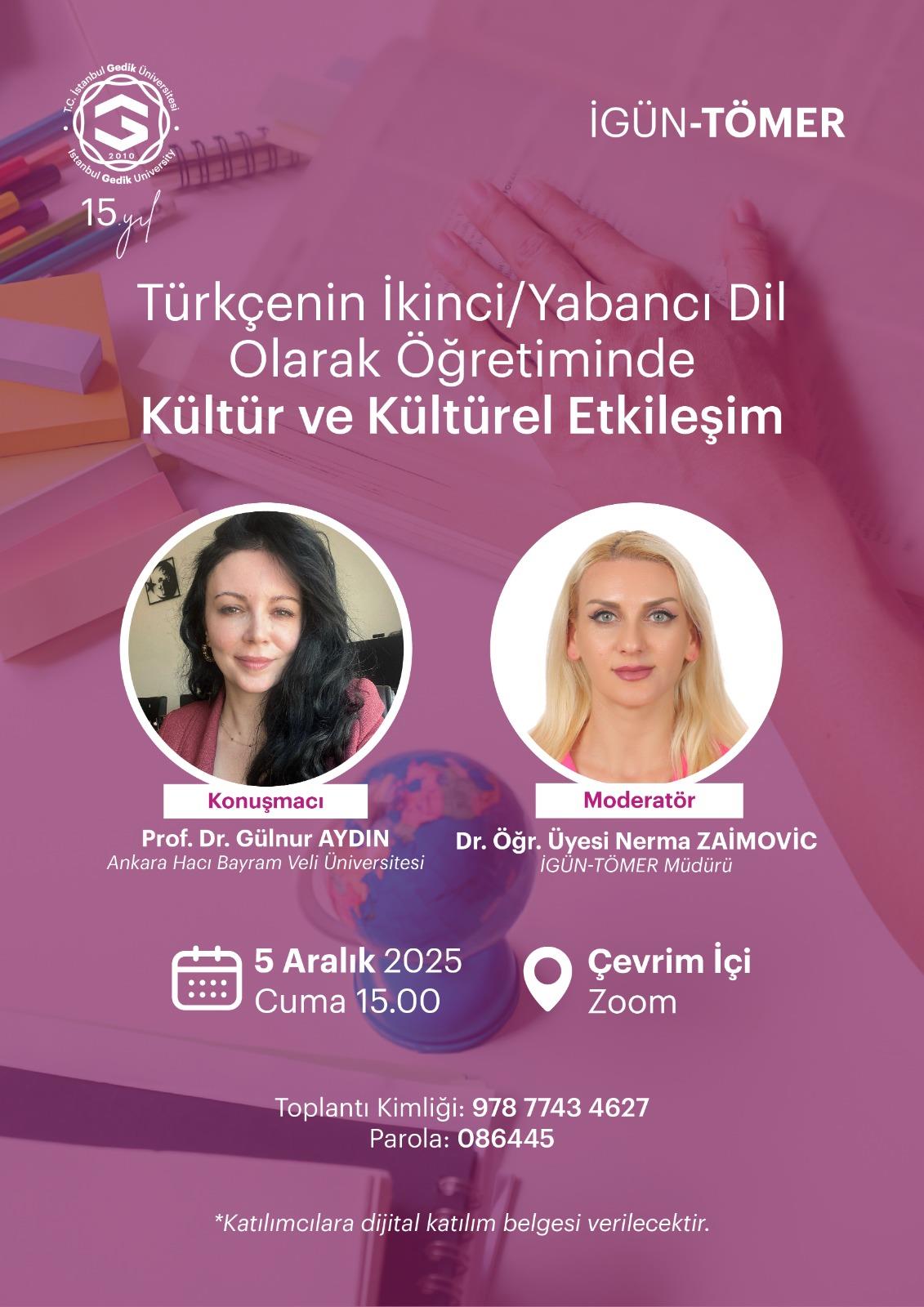 İstanbul Gedik Üniversitesi Türkçe Öğretimi Uygulama ve Araştırma Merkezi (İGÜN-TÖMER) tarafından, 05 Aralık 2025 Cuma günü “Türkçenin İkinci/Yabancı Dil Olarak Öğretiminde Kültür ve Kültürel Etkileşim” başlıklı çevrim içi bir toplantı düzenlenmiştir.